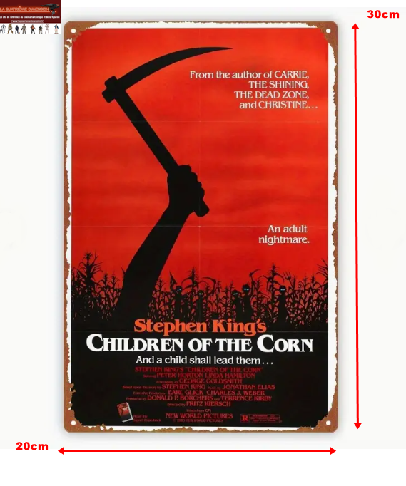 Panneau Métallique vintage du Film “Les démons du maïs” réalisé par Fritz Kiersch (20 x 30 cm).